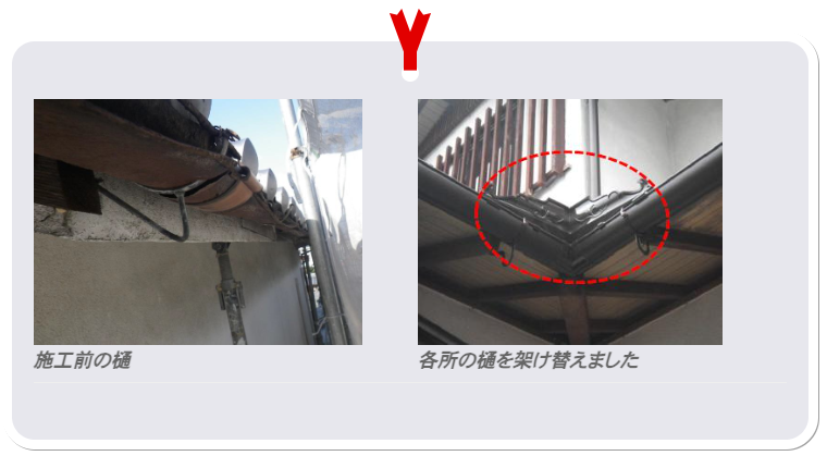 今回こだわったのが「樋」(とい)でしたが、わざわざ樋の見本を送っていただきましたし、「このメーカーのこの番手のこの色でお願いします」ときっちり決められるように配慮してくださったのです。結果、イメージ通りの「樋」が付きました。 |